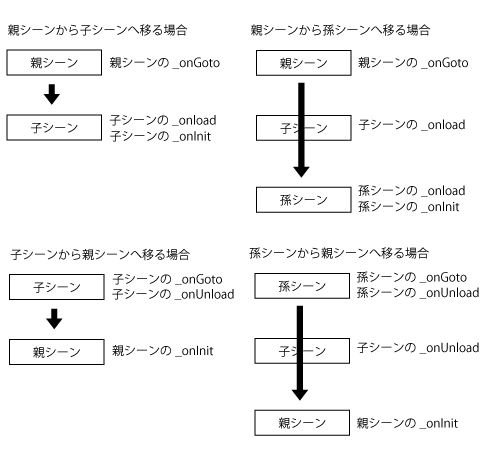 - 当該シーンへの到達時,通過時両方でこのメソッドが呼ばれることになります。直接,孫シーンへの到達が行われた際も考慮し,データのロードや削除しないオブジェクト等の設置はこのメソッドで行います。